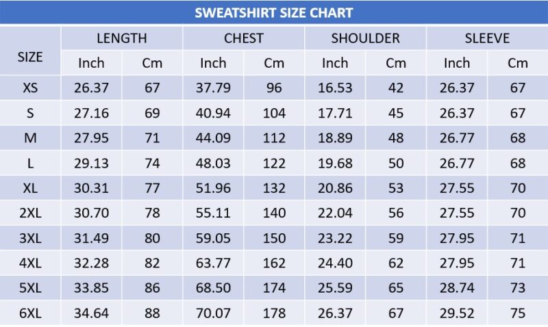 S, M, L, XL, 2XL, 3XL, 4XL, 5XL